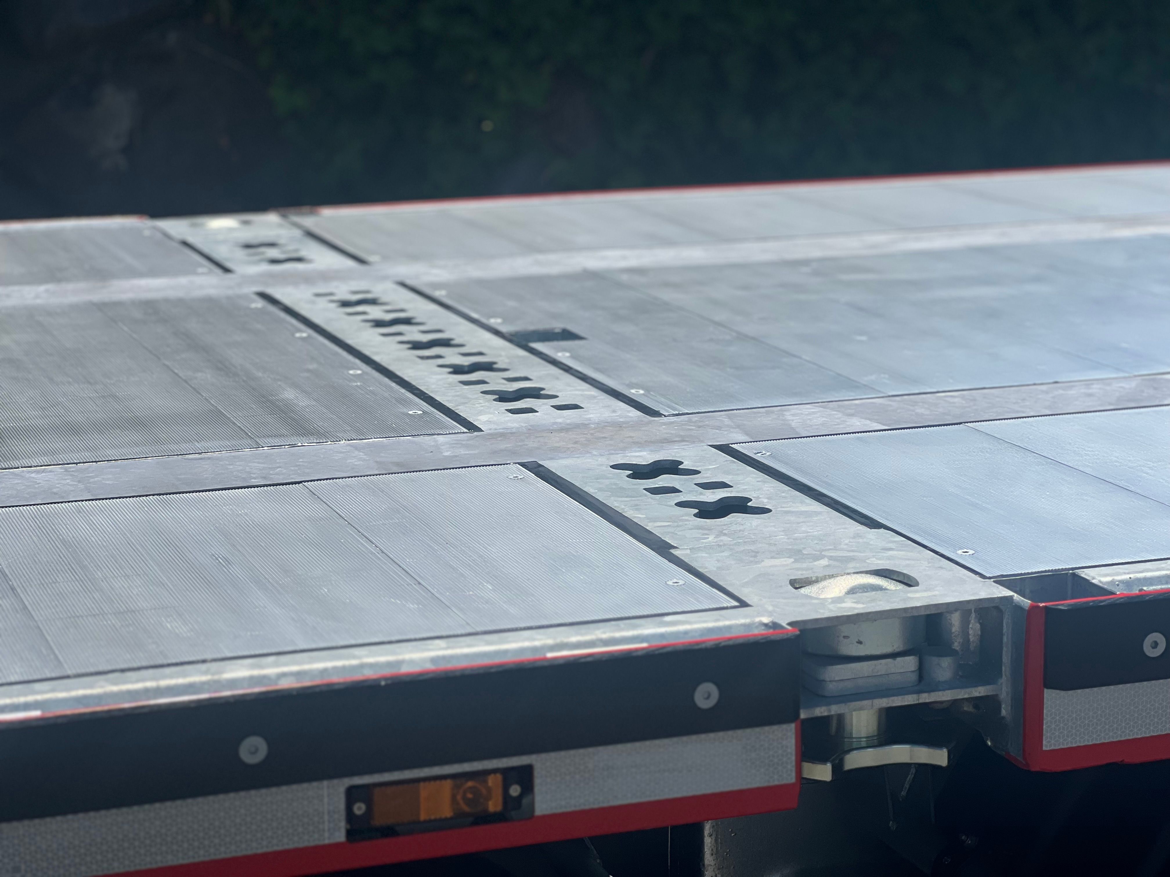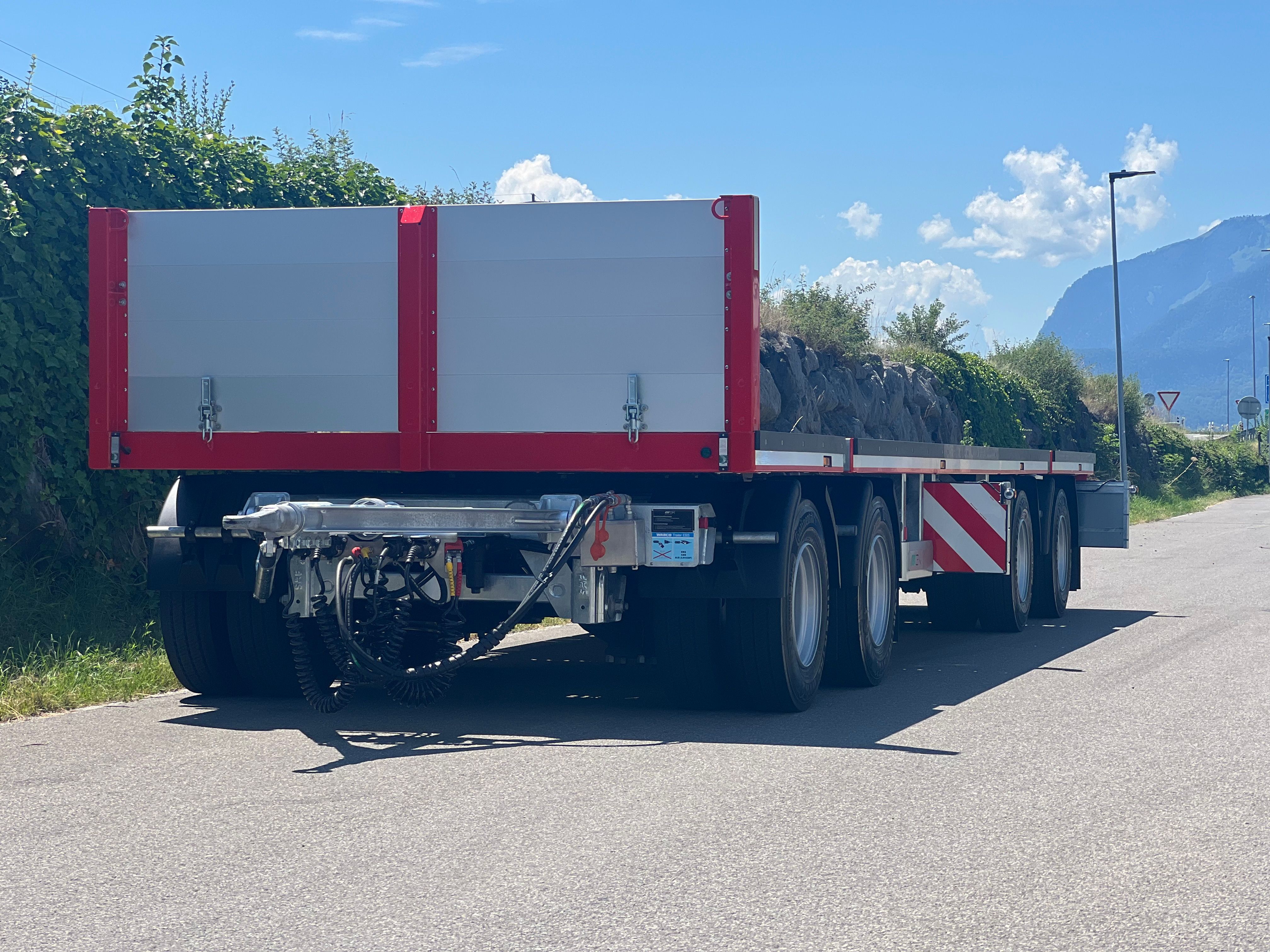 Das elektro-hydraulische Lenksystem auf der dritten und vierten Achse, gesteuert per Fernbedienung, gewährleistet eine hohe Manövrierfähigkeit. Das Multifix-Querträgersystem mit integrierten Rungensteckgehäusen, Container-Verriegelungen sowie zahlreiche Anschlag- und Zurrpunkte sorgt für maximale Flexibilität und Sicherheit bei der Ladungssicherung. Eine variable Stirnwandposition und der Stapleranfahrschutz ergänzen das Fahrzeug.