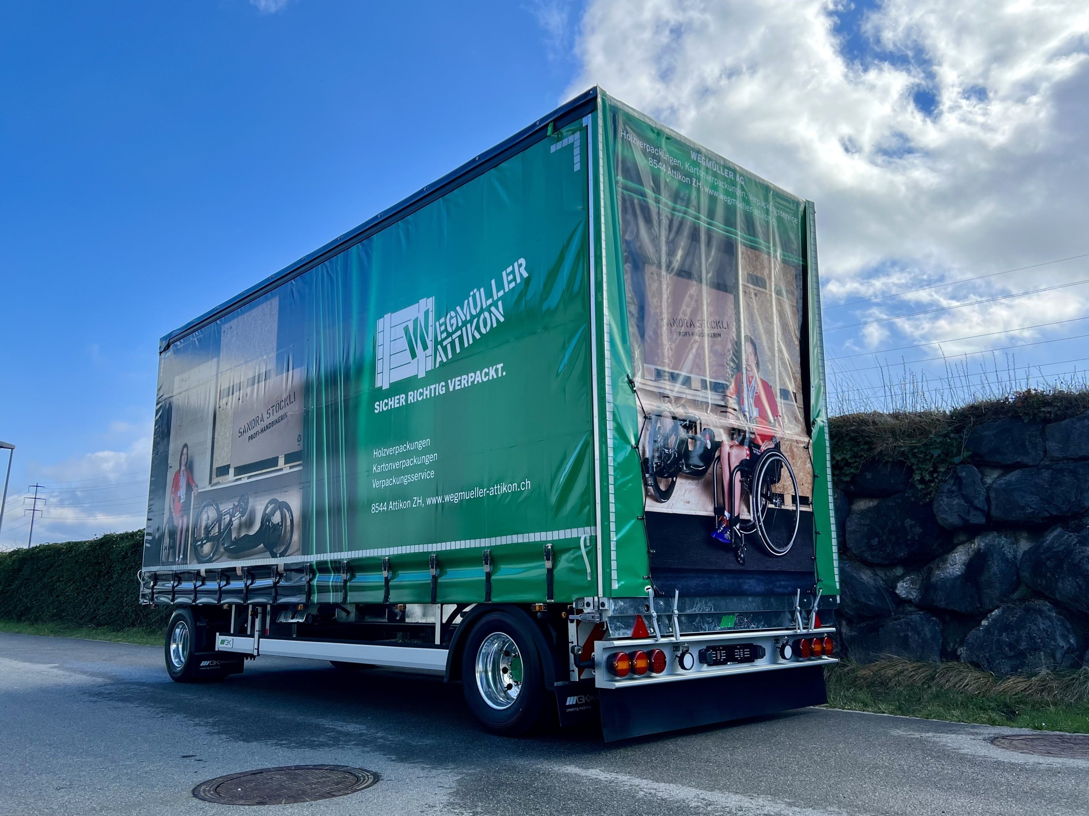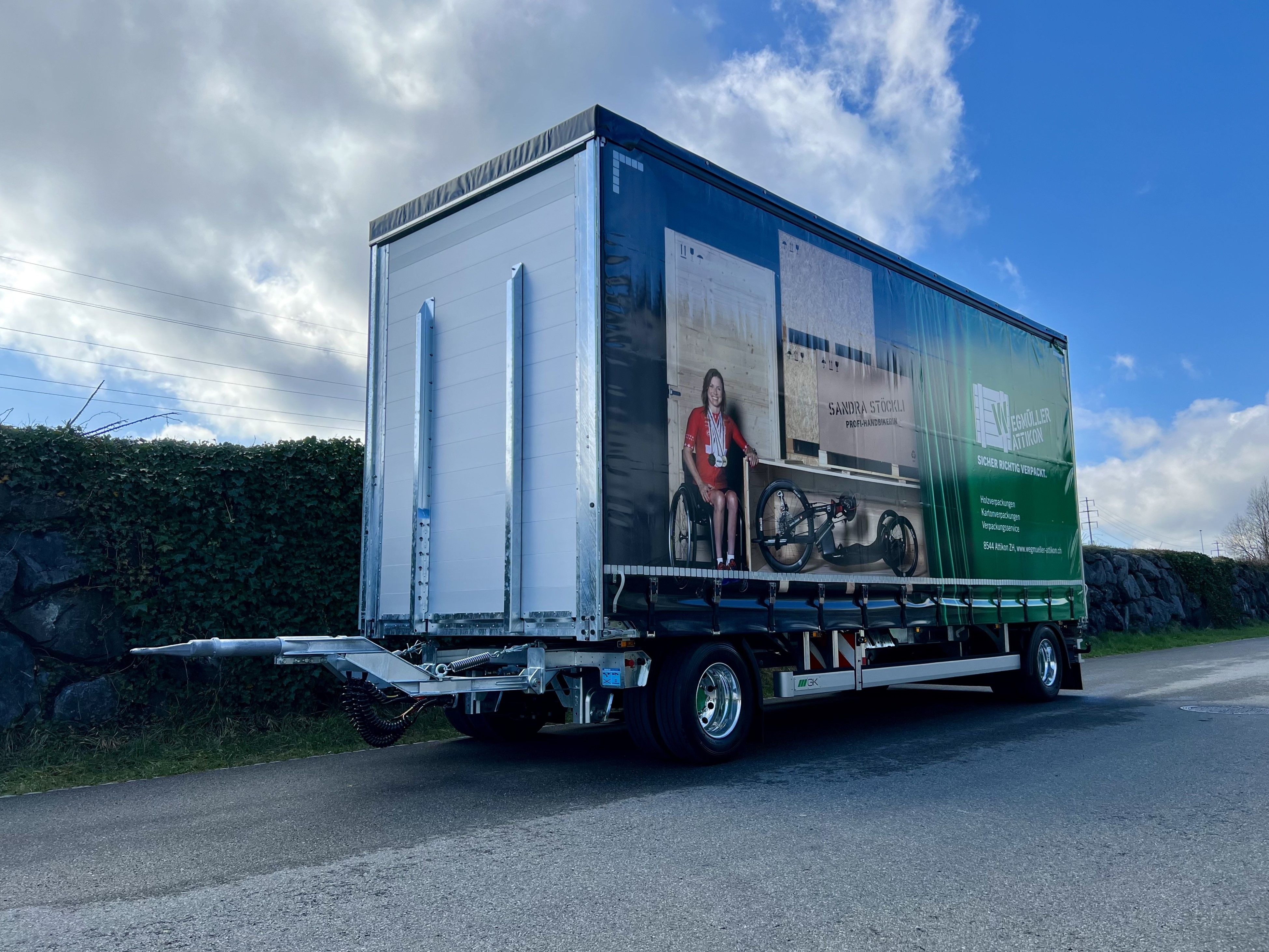 Für die Wegmüller AG Holz- und Kartonverpackungen realisierten wir zwei Fahrzeuge: einen 1-Achs Sattelanhänger und einen 2-Achs Drehschemelanhänger, jeweils mit Brückenaufbau. Beide Anhänger wurden in tiefer Bauweise ausgeführt und verfügen über ein mechanisches Hubdach.